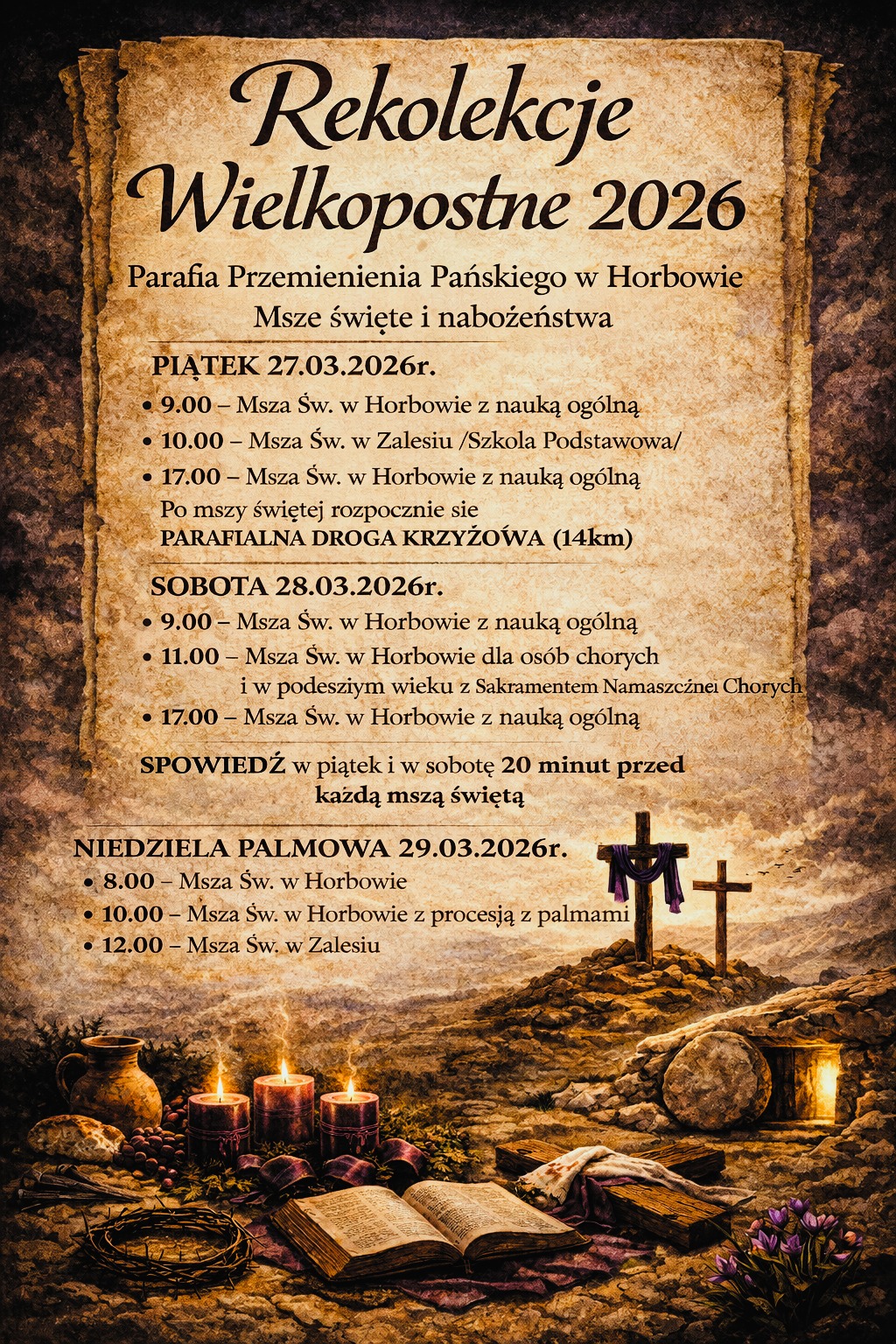 Zachęcamy wszystkich Parafian – dzieci, młodzież i dorosłych – do licznego i pobożnego uczestnictwa w tym świętym czasie przygotowania do Świąt Wielkanocnych.